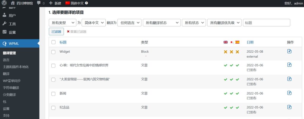 After re-creating the original website of Sichuan Museum on WordPress, we enabled WPML as a plug-in on WordPress to carry out the whole localization process. Since the original website is written in Chinese, we had to switch the default language on WPML to Chinese so that all strings automatically generated by the system would appear in Chinese.